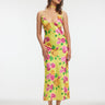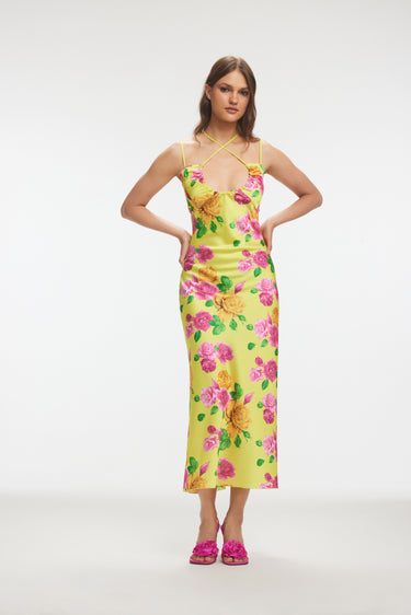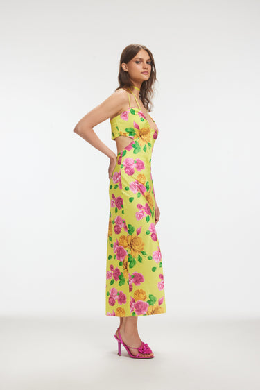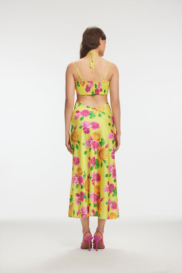 ROWEN Pleated Yellow Floral Print Midi Dress